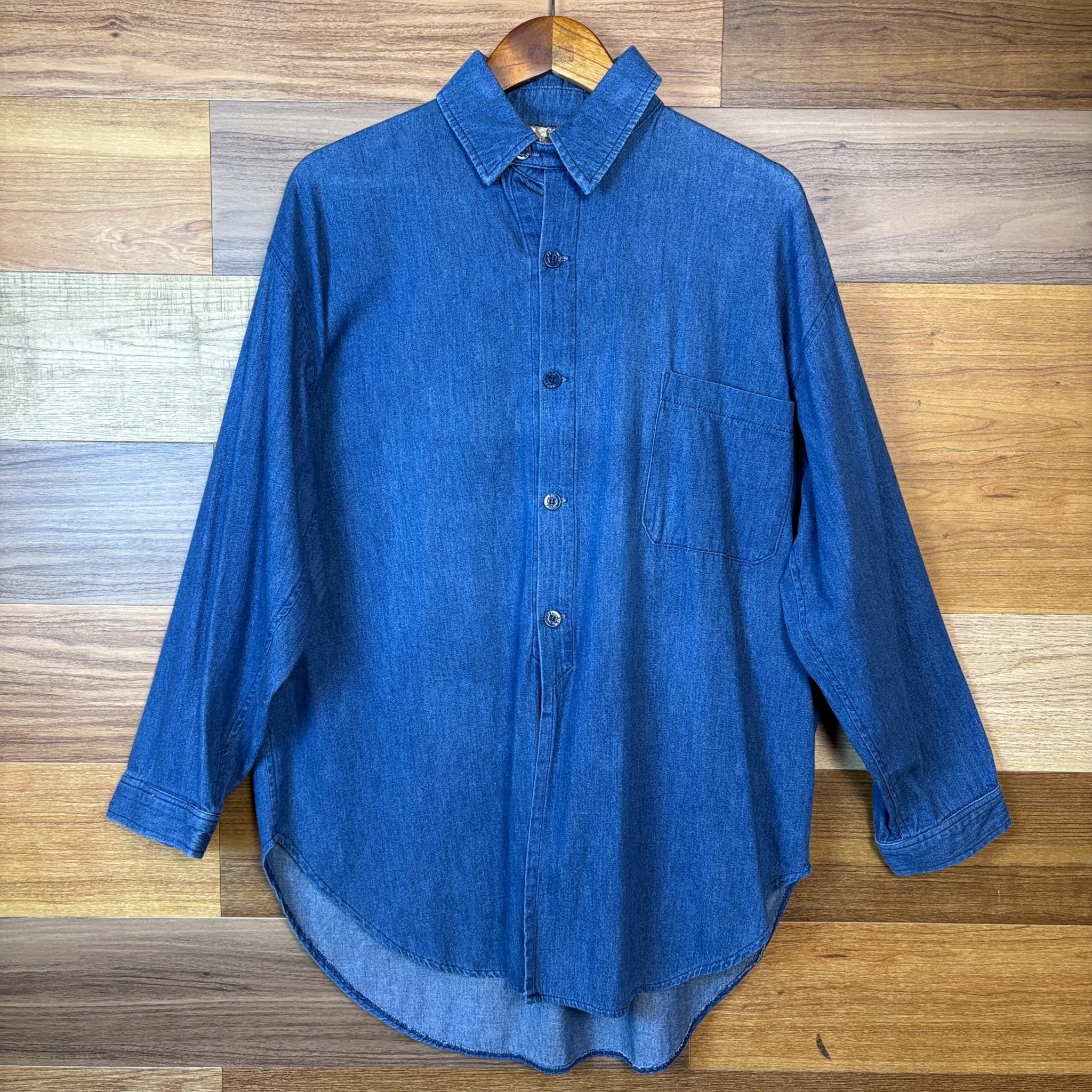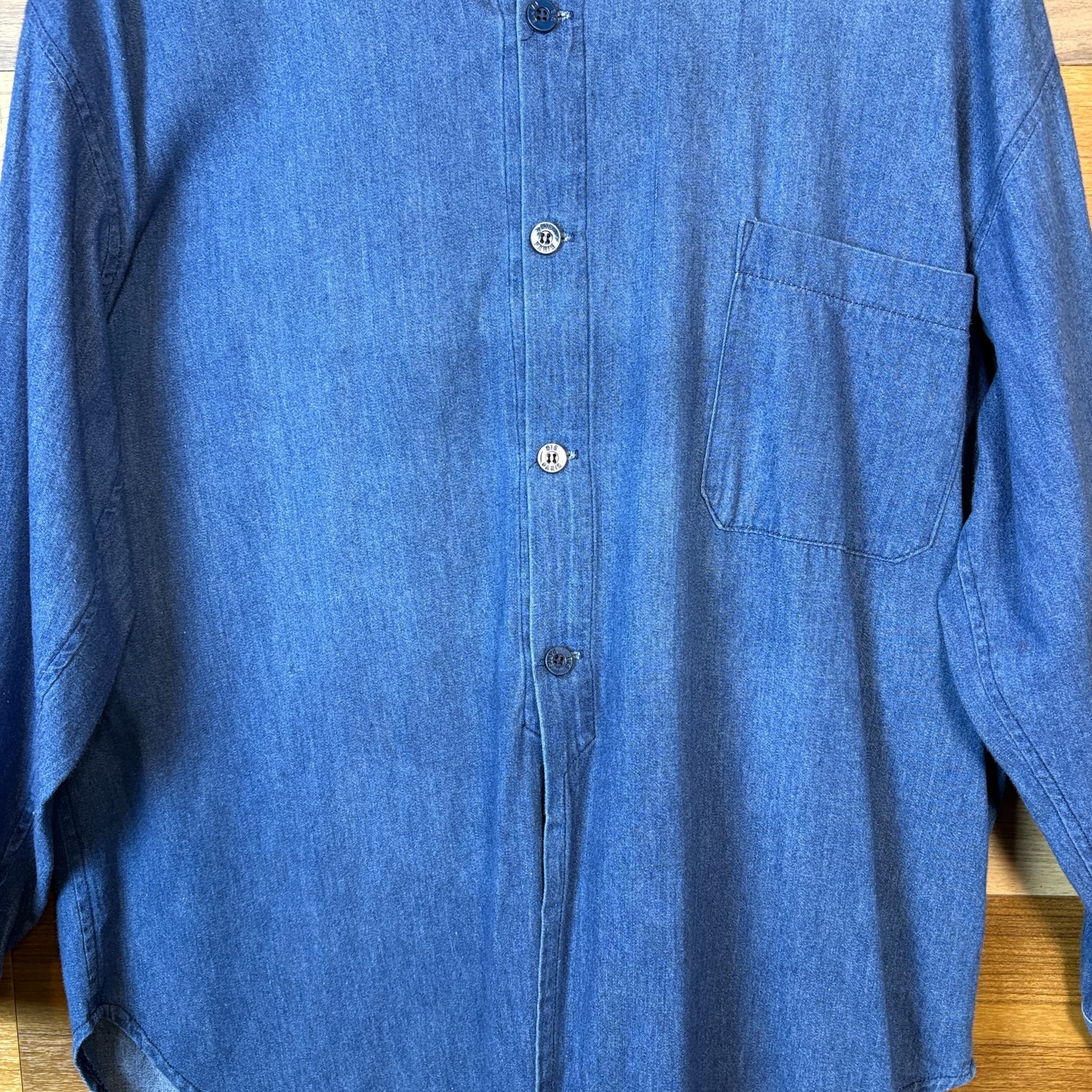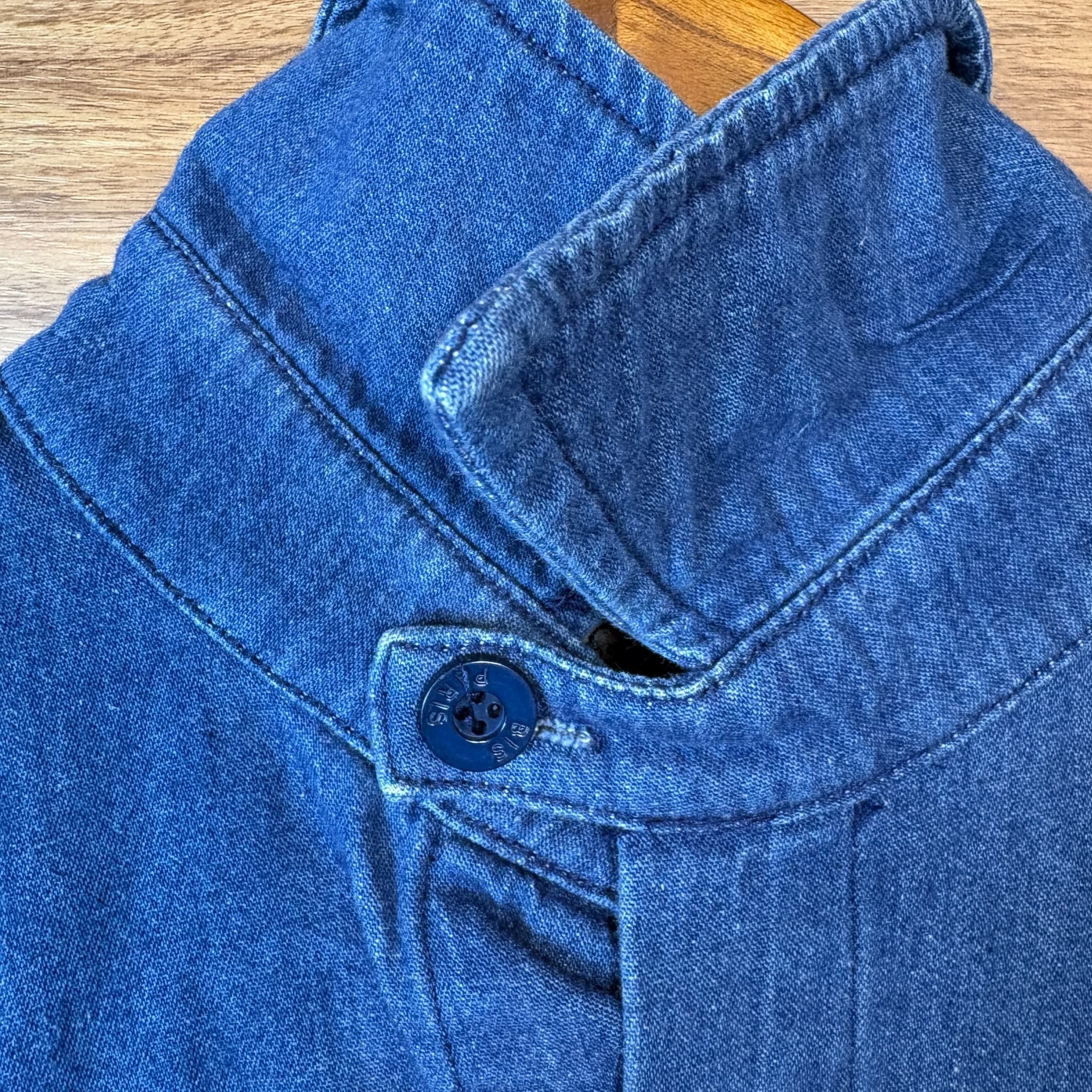 USA製 80s GENE EEING チンストラップ付き デニム ロング丈 長袖シャツ サイズ メンズ S 実寸XL位 アメリカ製 80年代 VINTAGE ビンテージ ヴィンテージ ストリート アメカジ 古着 r26010941