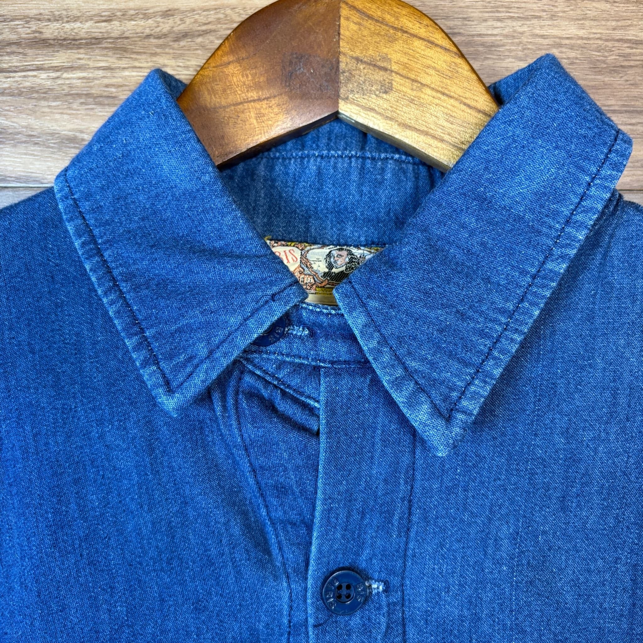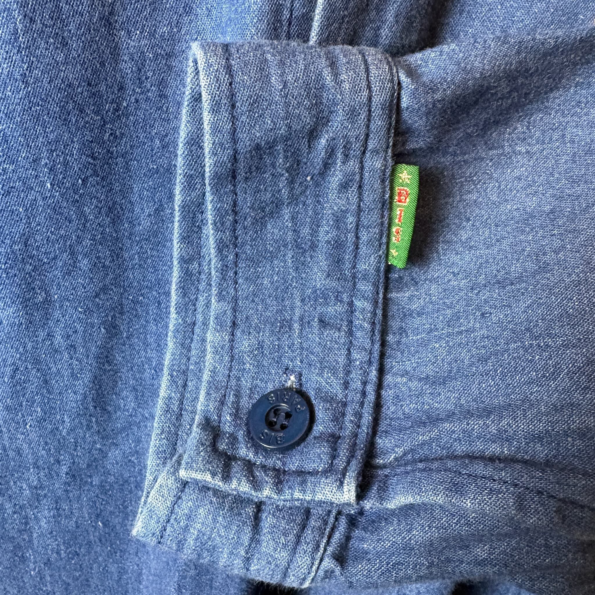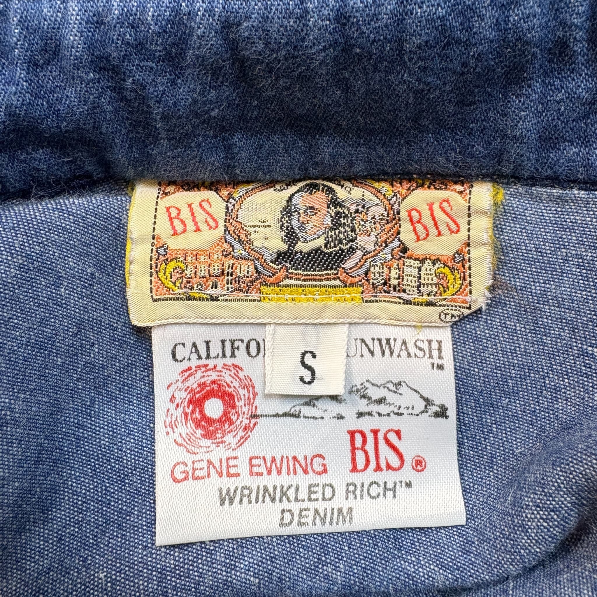 USA製 80s GENE EEING チンストラップ付き デニム ロング丈 長袖シャツ サイズ メンズ S 実寸XL位 アメリカ製 80年代 VINTAGE ビンテージ ヴィンテージ ストリート アメカジ 古着 r26010941